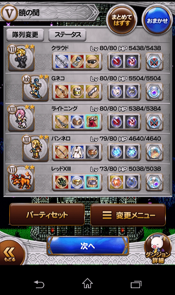 最初はライトニング入れずにスコールでいったり、レッドXIIIの代わりにアグリアス入れて乱命打たせてみたんですが、しっくり来なくて最終的にはこの編成で落ち着きました。